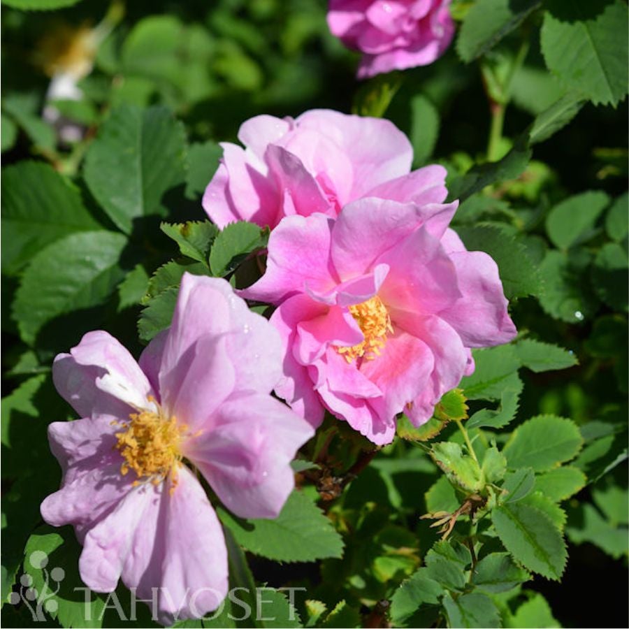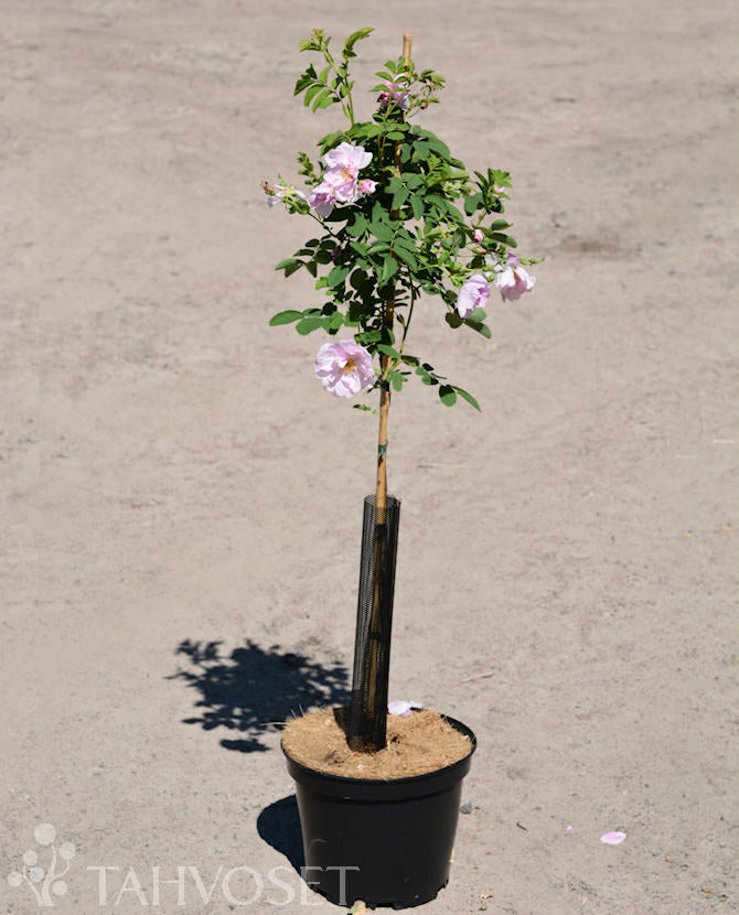 Keskikokoiset, vaaleanruusunpunaiset kukat ovat löyhästi kerrotut ja melko leveät. Terälehdissä voi toisinaan näkyä hentoja valkoisia raitoja. Miedosti tuoksuvia kukkia muodostuu sekä uusiin että vanhoihin versoihin.